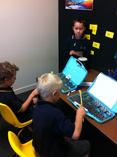 George, Jah and Ryan were working together using music to learn. George was following the numbers to play Twinkle Twinkle and then tried to problem solve how to play Jingle Bells. Alongside him Jah was using the glockenspiel to count to 100 and Ryan was providing the rhythm in the background - this was all at the same time. The boys had been working in the performance space for quite some time and waited until the sound box was empty so they could work in a quiet space. Great choices for learning.
