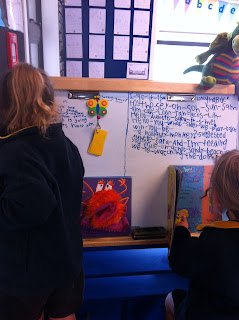 Here are Sophia G and Lucy working very hard to copy text from a picture book accurately on the board. They worked side by side for a long time copying the words together. Lucy has added dashes for where all the fingerspaces go. Well done girls!